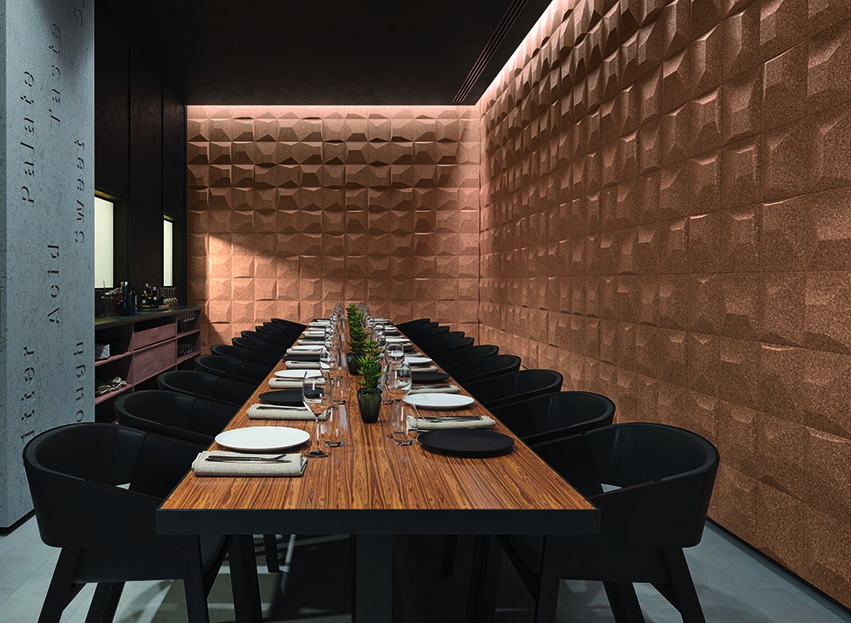 La revêtement mural GIZEH 3D NATURE en liège se présente sous forme de carreau individuel au relief sculpté .