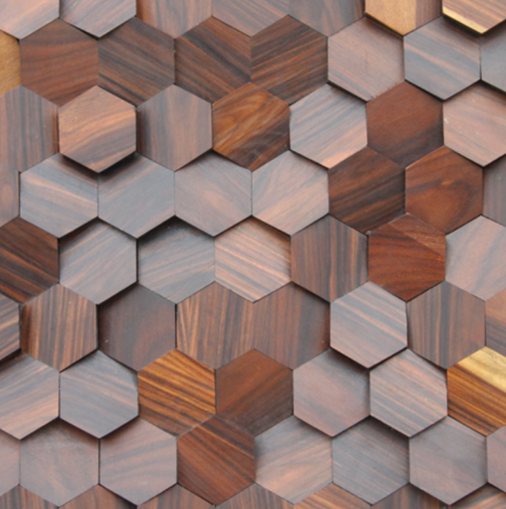 La mosaïque de bois HIVE se présente sous forme de panneau mural au relief décoratif .